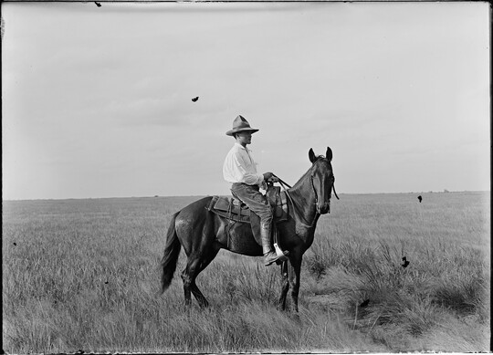 George Pattullo in his tenderfoot days, mounted and ready to ride the Texas plains. JA Ranch, Texas., 1908