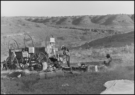 A Matador cook at the business end of a chuck wagon after the cowpunchers have had breakfast and gone for a day's work. Matador Ranch, Texas., 1909
