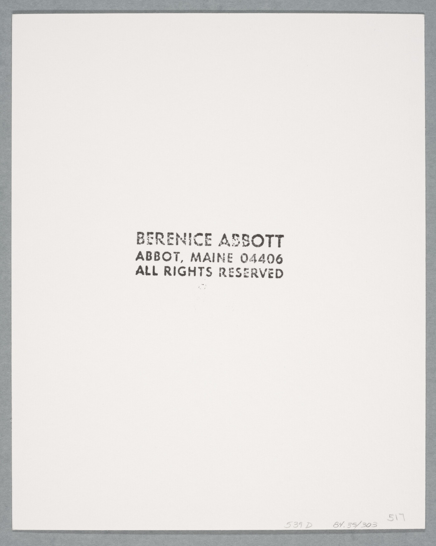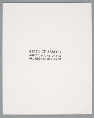 c. [stamp]: BERENICE ABBOTT \ ABBOT, MAINE 04406 \ ALL RIGHTS RESERVED