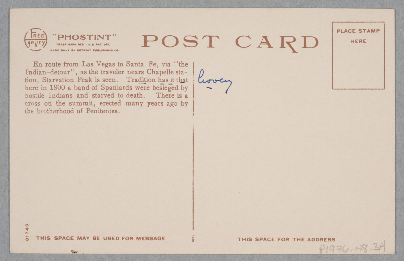 l.l. to l.c. printed in gold, below image: H-3513 STARVATION PEAK, BETWEEN LAS VEGAS AND SANTA FE, NEW MEXICO.