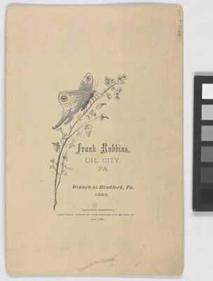 c. printed: Frank Robbins, \ OIL CITY, \ PA. \ Branch at Bradford, Pa. \ 1882. \ NEGATIVES PRESERVED. \ ADDITIONAL COPIES OF THIS PICTURE CAN BE HAD AT \ ANY TIME.