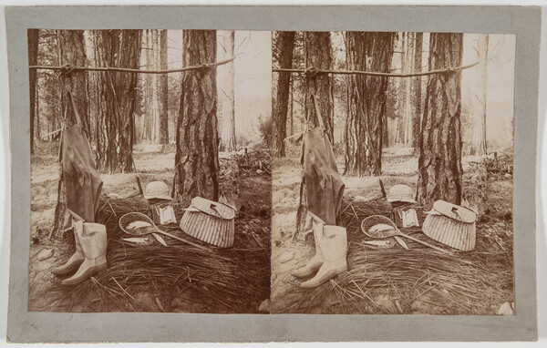 [Still life of fishing gear on bed of reeds next to trees]