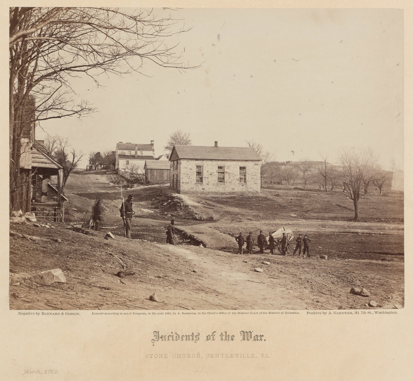 l.c. printed: Entered according to act of Congress, in the year 1865, by A. Gardner, in the Clerk's Office of the District Court of the District of Columbia. \ Incidents of the War. \ STONE CHURCH, CENTREVILLE, VA. \ [in red ink] 4 \ Published by PHILP & SOLOMONS, Washington.
