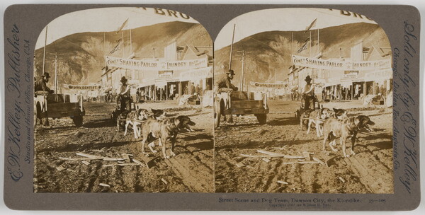 l.c. to l.r. printed: Street Scene and Dog Team, Dawson City, the Klondike. 55-105 \ Copyright 1900 by William H. Ran.