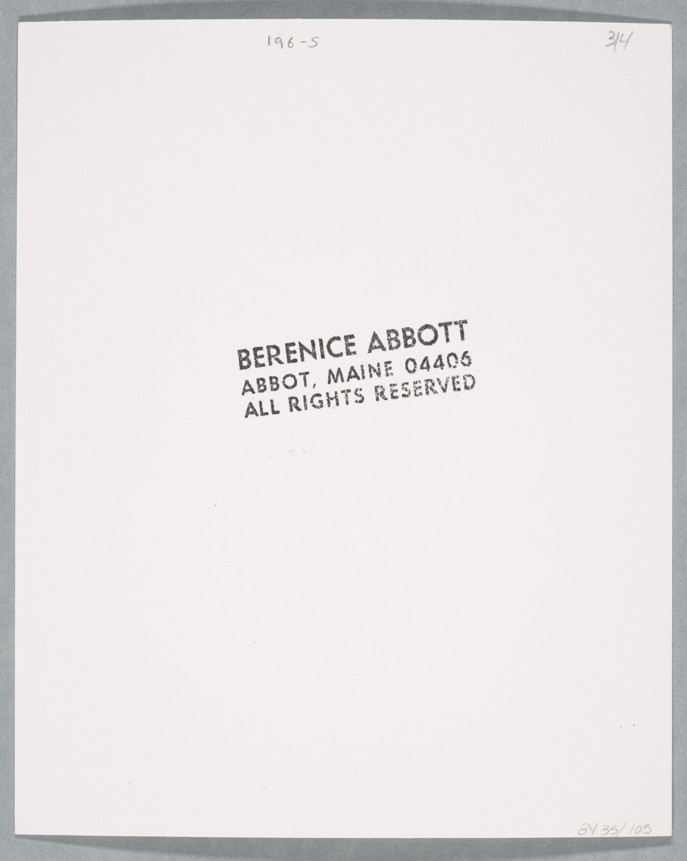 c. [stamp]: BERENICE ABBOTT \ ABBOT MAINE 04406 \ ALL RIGHTS RESERVED