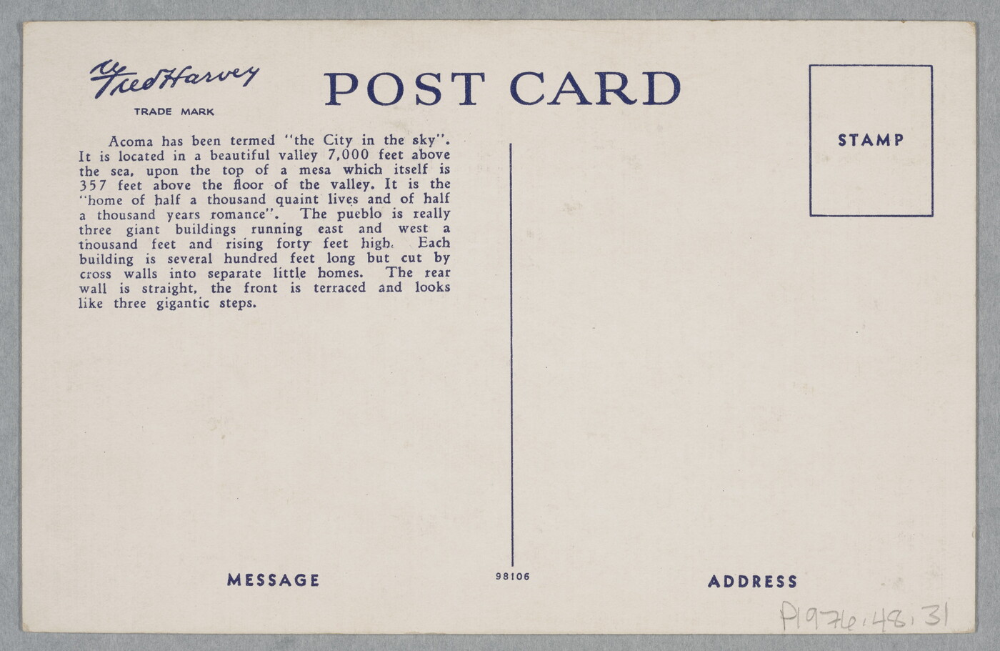 u.l. printed: Acoma has been termed "the City in the sky". \ It is located in a beautiful valley 7,000 feet above \ the sea, upon the top of a mesa which itself is \ 357 feet above the floor of the valley. It is the \ "home of half a thousand quaint lives and of half \ a thousand years of romance". The pueblo is really \ three giant buildings running east and west a \ thousand feet and rising forty feet high. Each \ building is several hundred feet long but cut by \ cross walls into separate little homes. The rear \ wall is straight, the front is terraced and looks \ like three gigantic steps.