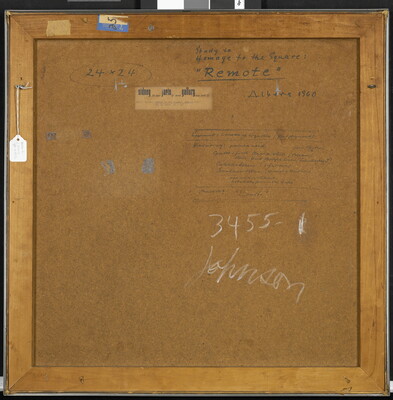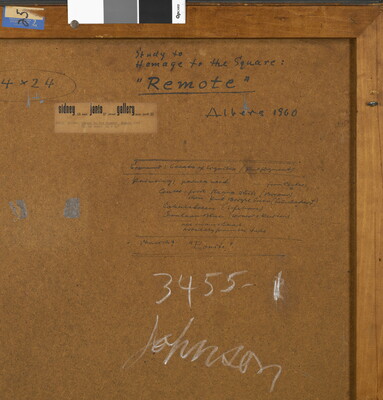 u.c. on white label: sidney 15 east janis 57 street gallery new york 22 \ #8741 ALBERS Homage to the Square: Remote [underlined] 1960 \ Oil on board 24 x 24"