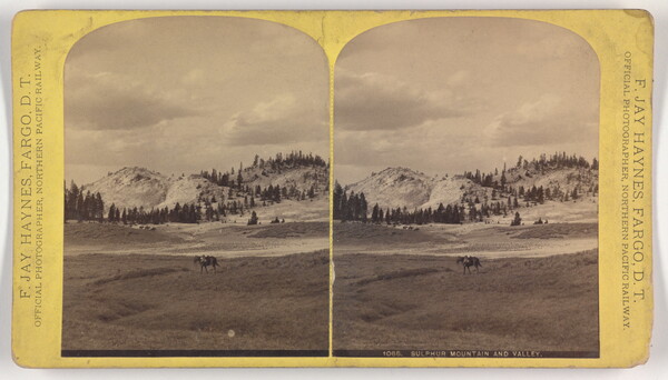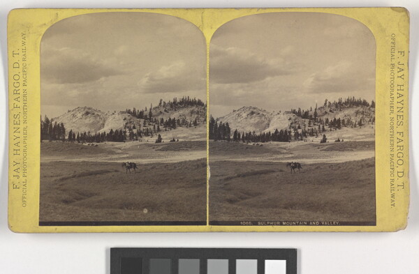 c. printed: Northern Pacific Views, \ ALONG THE LINE OF THE \ NORTHERN PACIFIC RAIL-ROAD, \ FROM \ LAKE SUPERIOR TO THE ROCKY MOUNTAINS, \ UPPER MISSOURI, BLACK HILLS, \ and the famous Yellowstone Park. \ Finest Scenery in the Northwest -- Over 1200 subjects. \ Catalogues Free. Published by \ F. JAY HAYNES, \ OFFICIAL PHOTOGRAPHER, N.P.R.R. \ FARGO, D.T.