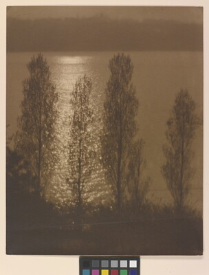 inscribed: "Sunlight.on.Hudson River" \ Trees, Riverside Park. \ Sepia Bromide \ 1911 \ BSR