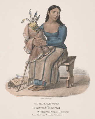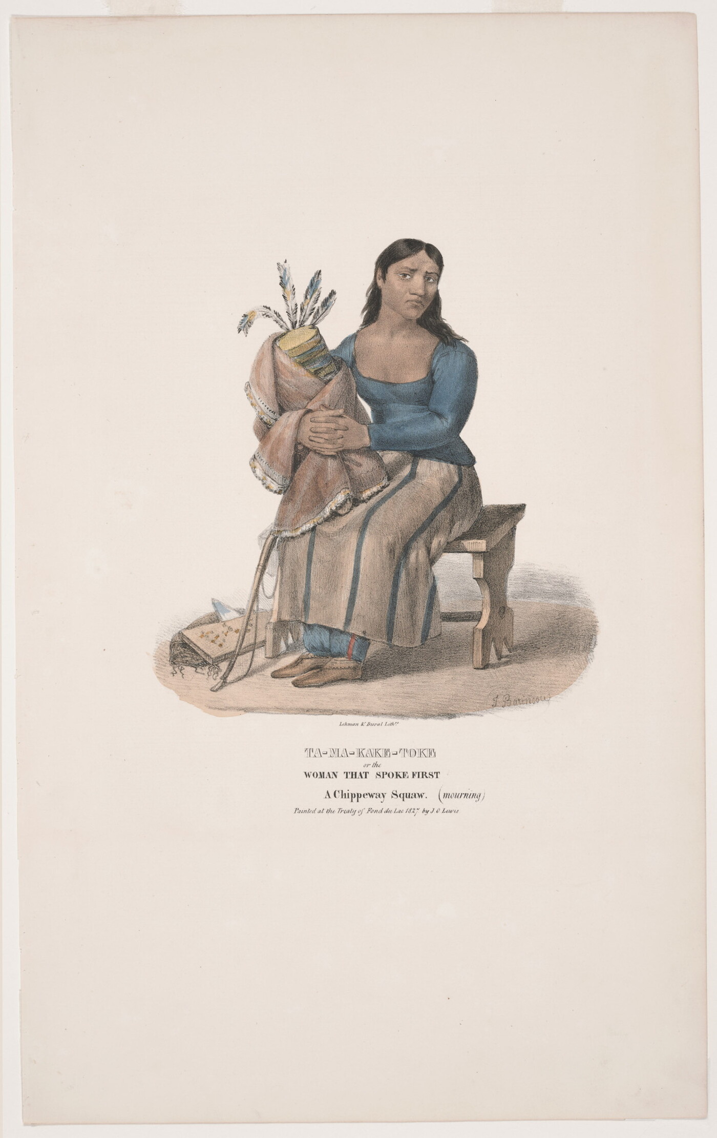 l.c.: Lehman & Duval Lith[rs]. \ TA-MA-KAKE-TOKE \ or the \ WOMAN THAT SPOKE FIRST \ A Chippeway Squaw. (mourning) \ Painted at the Treaty of Fond du Lac 1827 by J.O. Lewis