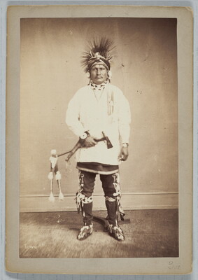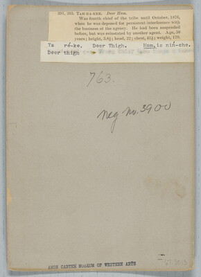 u.c. to u.r. printed on paper label: 391, 395. TAH-RA-KEE. Deer Ham. \ Was fourth chief of the tribe until October, 1876 \ when he was deposed for persistent interference with \ the business of the agency. He had been suspended \ before, but was reinstated by another agent. Age, 50 \ years; height, 5.8 1/2; head, 22; chest, 41 1/2; weight, 179