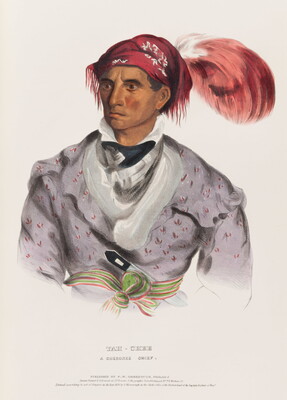 l.c. engraved on stone: TAH-CHEE \ A CHEROKEE CHIEF. \ PUBLISHED BY F.W. GREENOUGH, PHILAD.A \ Drawn Printed & Coloured at I.T. Bowen's Lithographic Establishment No. 94 Walnut St. \ Entered according to act of Congress in the Year 1838 by F.W. Greenough in the Clerks Office of the District Court of the Eastern District of Penn.a