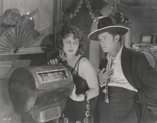 [Theodore Kosloff and Dorothy Dalton in bar, knife pinning fan to wall, "Fool's Paradise"]