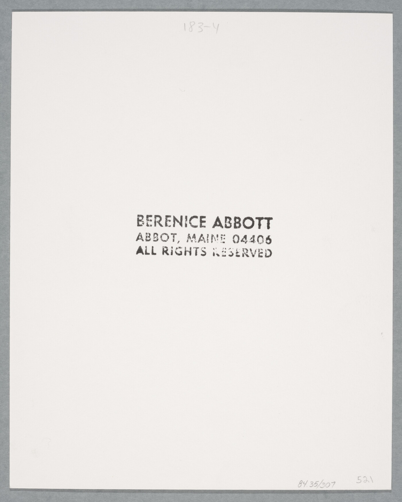 c. [stamp]: BERENICE ABBOTT \ ABBOT, MAINE 04406 \ ALL RIGHTS RESERVED