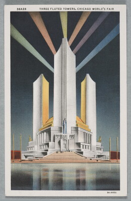 u.l. to u.r. printed in black, above image: 36A28 THREE FLUTED TOWERS, CHICAGO WORLD'S FAIR