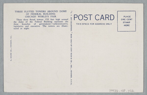 u.l. printed: THREE FLUTED TOWERS AROUND DOME \ OF FEDERAL BUILDING \ CHICAGO WORLD'S FAIR \ These three fluted towers 150 feet high around \ the dome of the Federal Building represent the \ three branches of government - administrative, \ legislative and executive. The towers are illumi- \ nated at night.