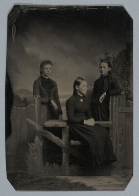 [Three girls posed around wood fence studio prop]