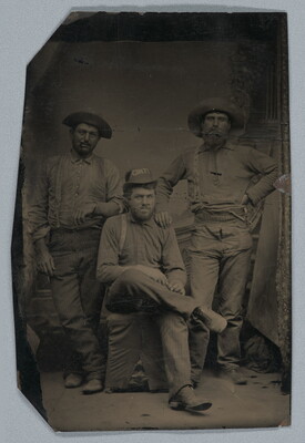 [Three men in hats, two standing, one seated, full-length]