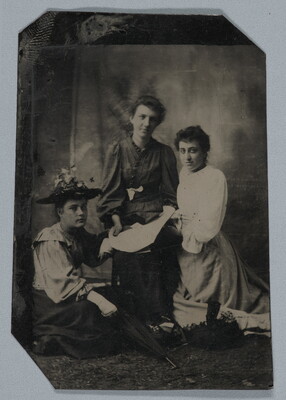 [Three women holding sheet of paper in center]
