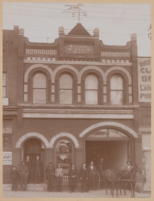 [Portrait of men standing in front of Williams and Welty building], ca. 1900