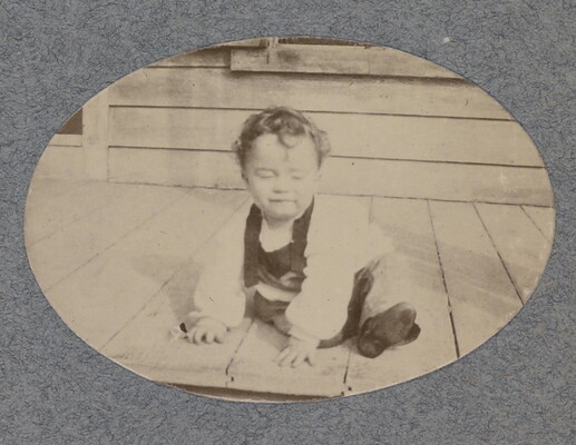 [Toddler seated on porch]
