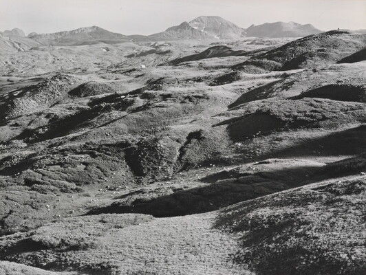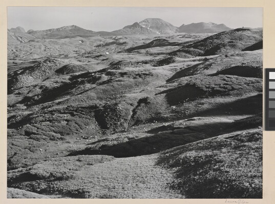 l.r. typed on blue paper label: In summer an occasional sheep herder, far from his nearest neighbor, \ pitches his lonely tent while he guards and watches his sheep as they grow \ fat on the nutritious weeds and grasses which grow above timberline.