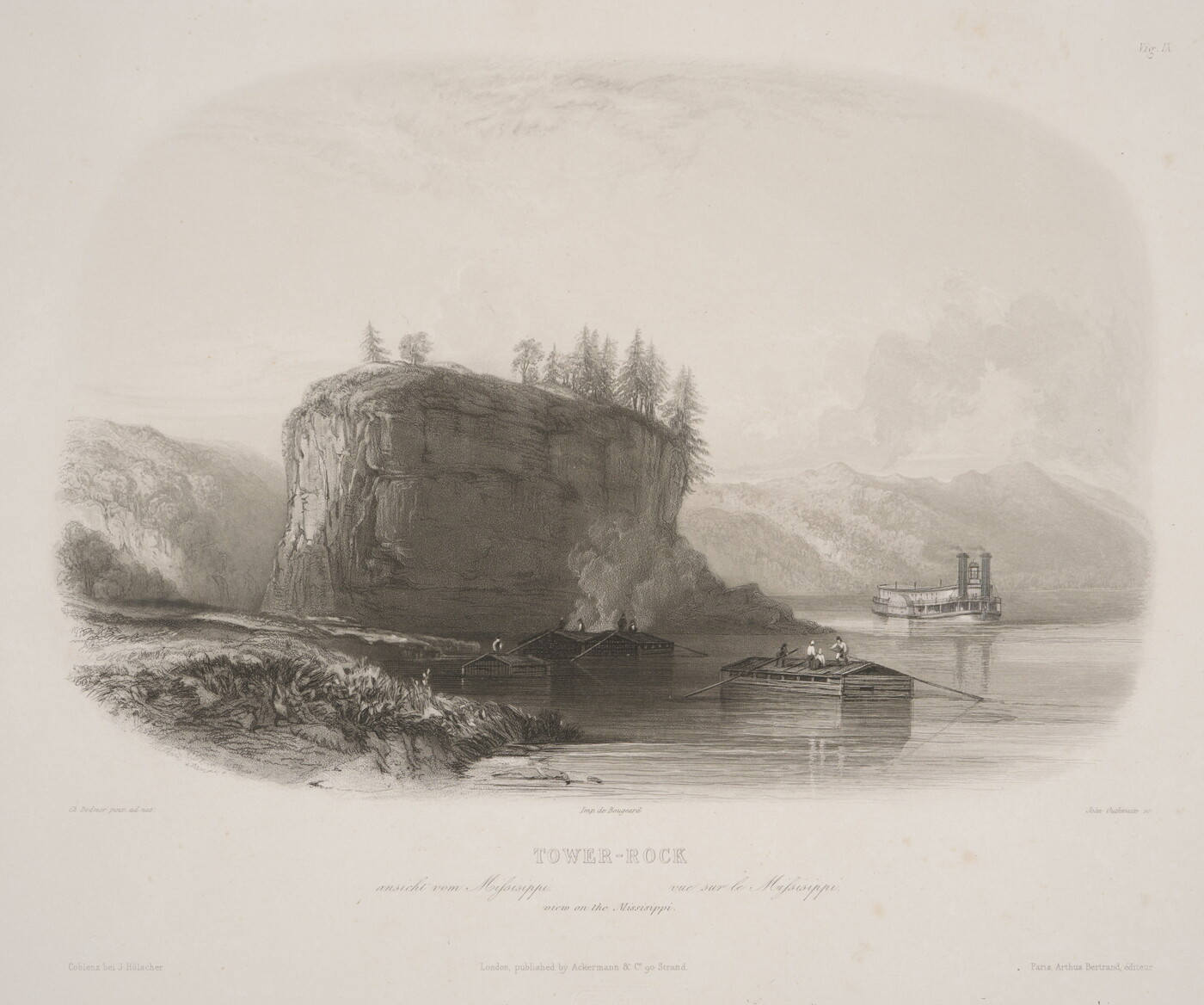 l.c. Imp. de Bougeard \ TOWER-ROCK \ ansicht vom Mississippi vue sur le Mississippi \ view of the Mississippi \ London, published by Ackermann & Co. 90 Strand [blind stamp]