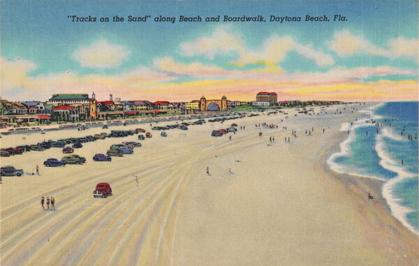 u.c. printed: "Track on the Sand" along Beach and Boardwalk, Daytona Beach, Fla.