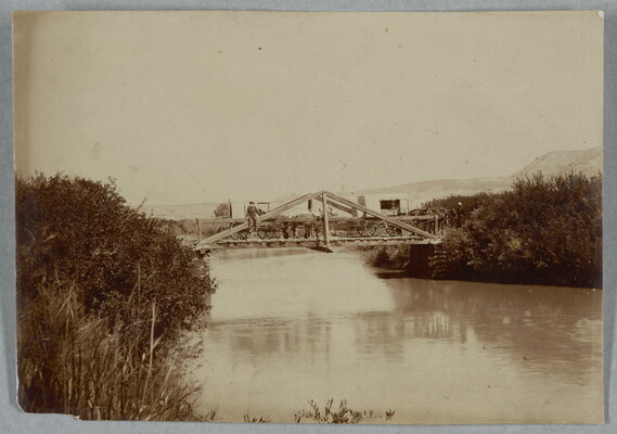 [Two covered wagons on a bridge]