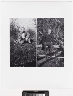 Two self-portraits of Chester Eisenhuth. With a dog, 4/22/52 [left]; and sitting on a fence, 1950s [right]