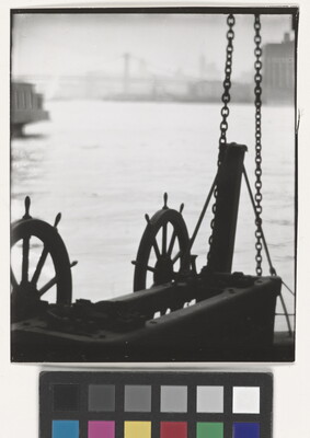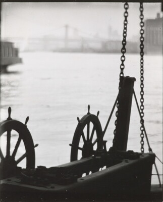 [Two wheels on dock, Brooklyn Bridge in background]