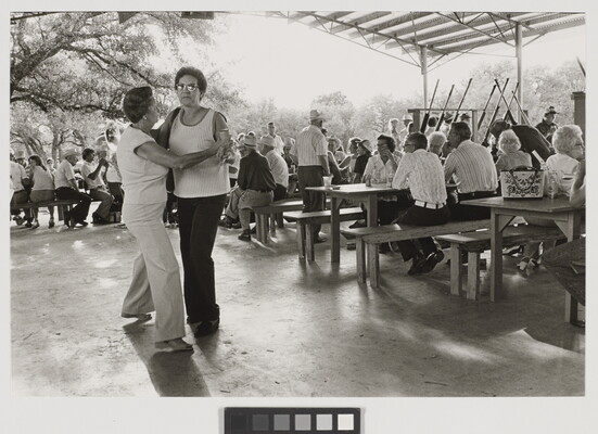 [Two women dancing near onlookers seated at picnic tables]