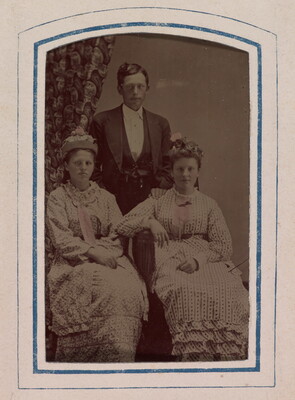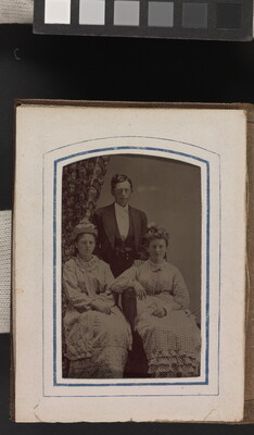 [Two young women seated, man standing]