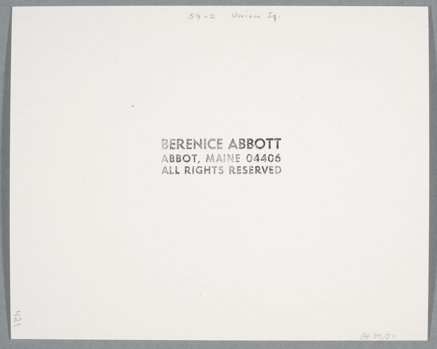 c. stamp: BERENICE ABBOTT \ ABBOT, MAINE 04406 \ ALL RIGHTS RESERVED