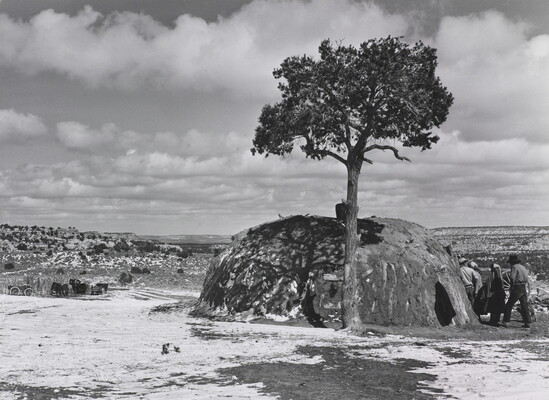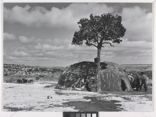 u.c. on paper label: [printed]: A PHOTOGRAPH BY \ LAURA GILPIN \SANTA FE, NEW MEXICO \ [typed]: UPRIGHT LOG HOGAN \ COUNSELOR, NEW MEXICO \ 1955 \ from THE ENDURING NAVAHO \ UNIVERSITY OF TEXAS PRESS. PUB.
