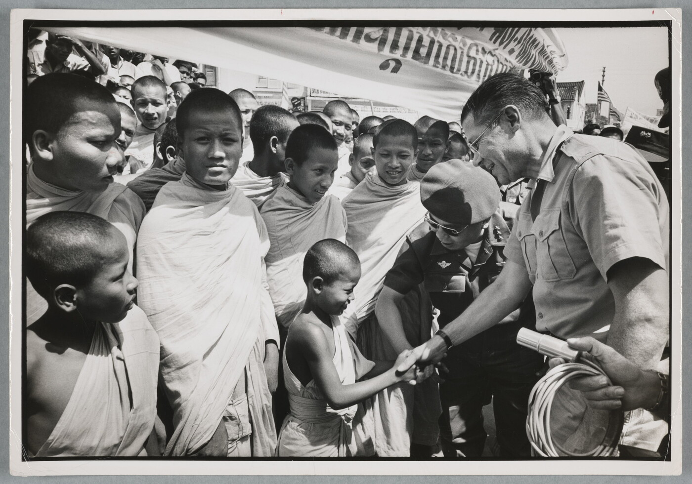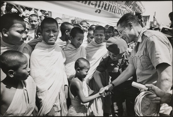 U.S. Defense Secretary Robert McNamara, with Premier of Vietnam, General Nguyen Khanh, greeting Buddhists as part of a morale-building trip to villages in the Delta area of Vietnam
