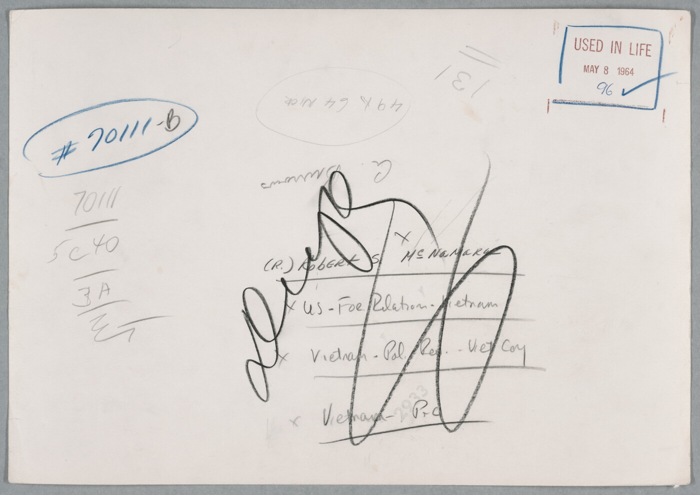 c. in graphite: [upside down] 49 & 64 NICK 131 / L. Burrows / [right side up but marked over top with black porous point pen] (R.) Robert S. McNaMara / x US - For. Relation - Vietnam / x Vietnam - Pol. Rev. - Viet Cong / x Vietname - Prc