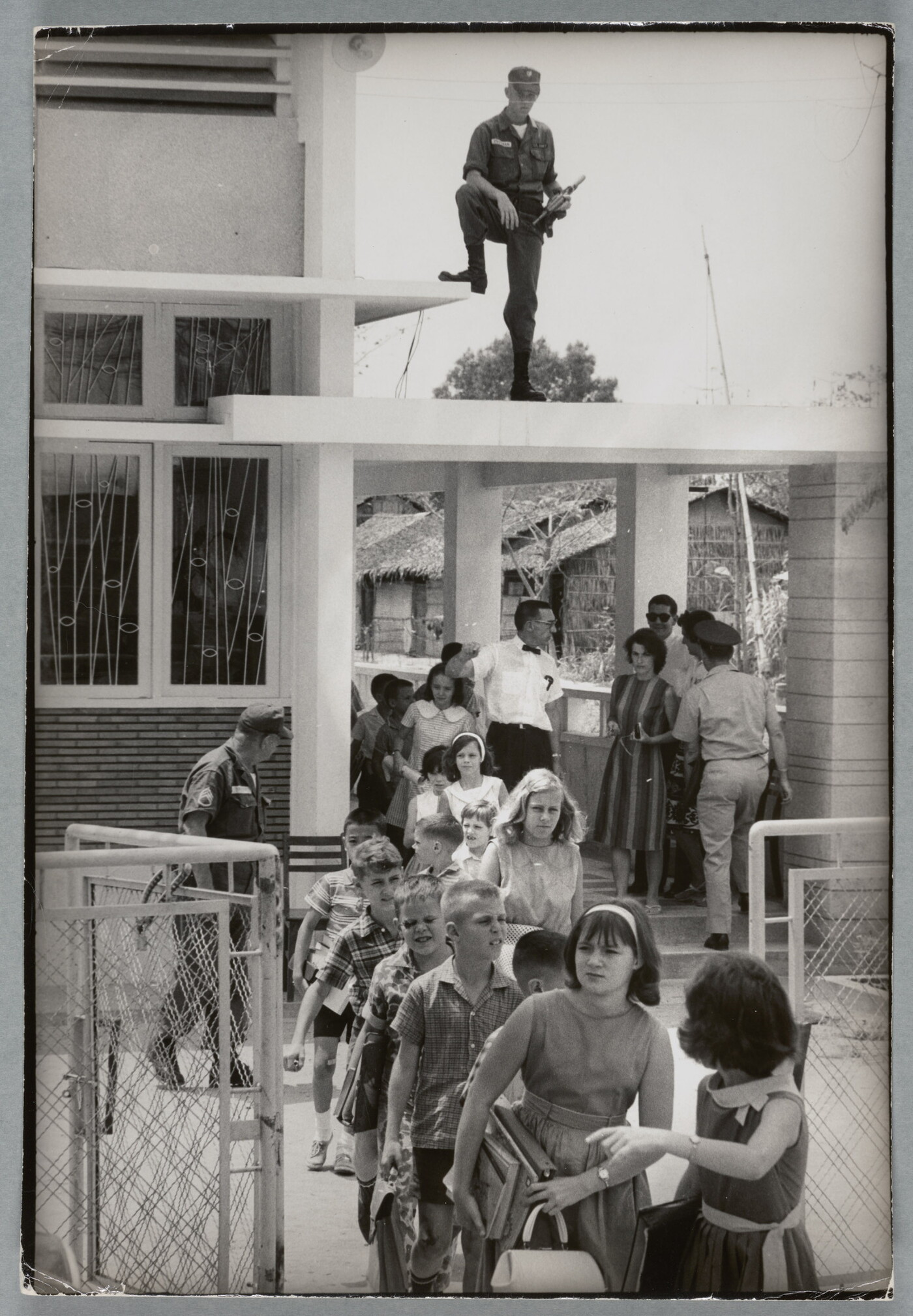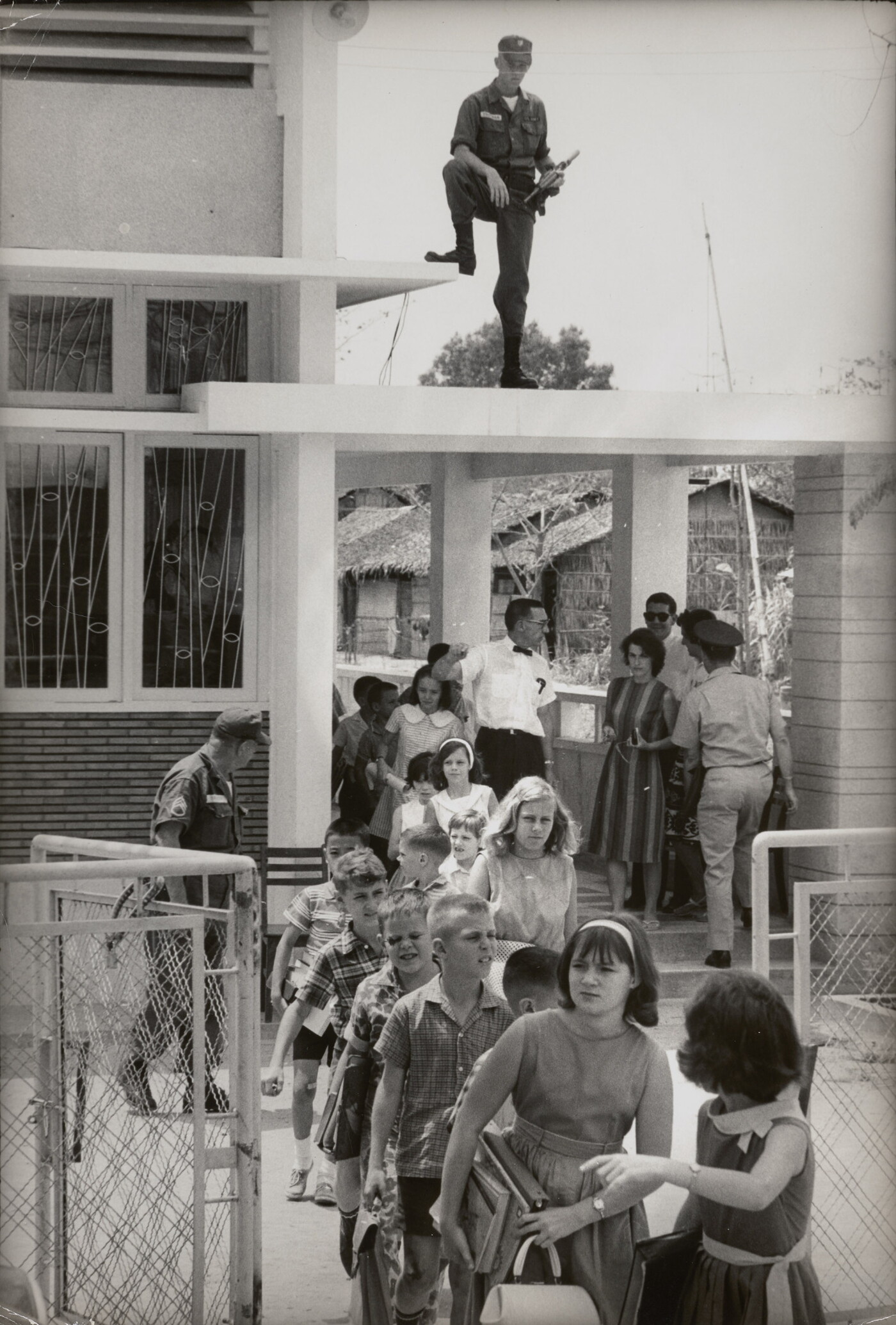 U.S. Soldiers in Vietnam guard an American school in Saigon after Viet Cong terrorist bombings