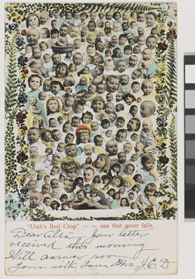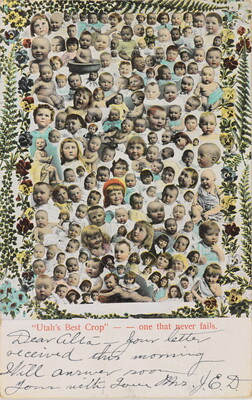 l.l. to l.r. printed: "Utah's Best Crop" - - one that never fails. \ [in ink]: Dear Alta - Your letter received this morning \ Will answer soon \ Yours with Love Mrs. J.E.D.