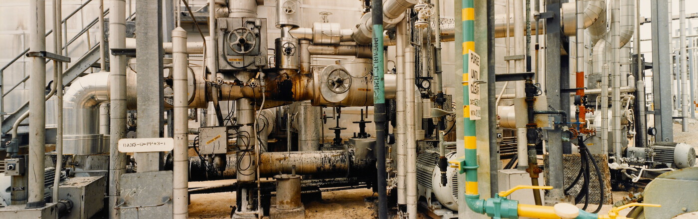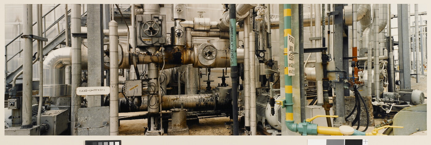 inscribed: TX 406 PIPES FROM CRUDE STORAGE TANK, DU PONT LA PORTE METHANOL COMPLEX, LA PORTE, TEXAS, SPRING 1984--FROM "THE WORLD IN A FEW STATES"