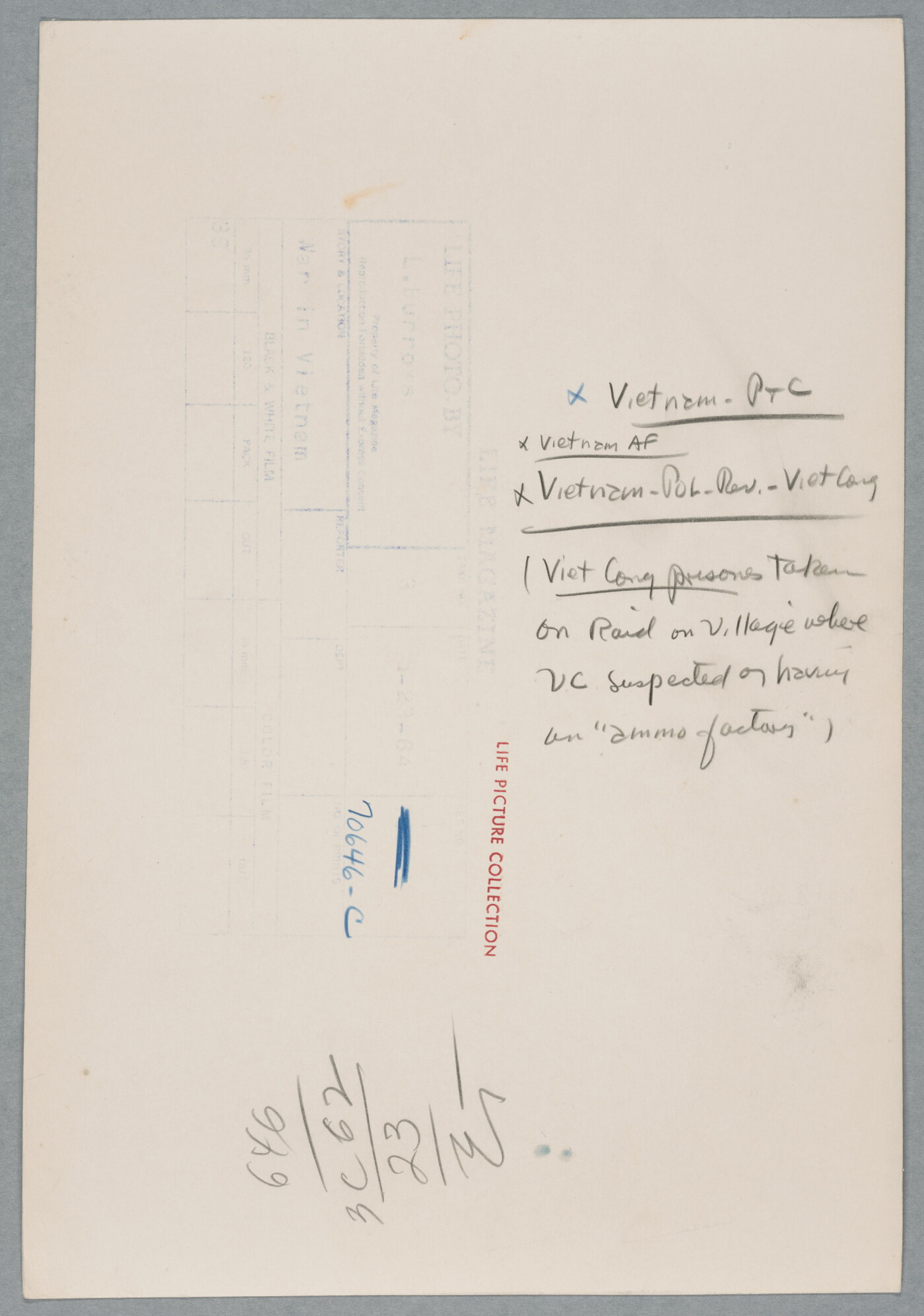 c. right in graphite: x Vietnam p P&C / x Vietnam AF / x Vietnam - Pol - Rev. - Viet Cong / (Viet Cong prisoners Taken / on Raid on village where / VC suspected of having / an "ammo factory")