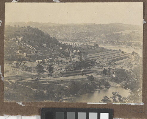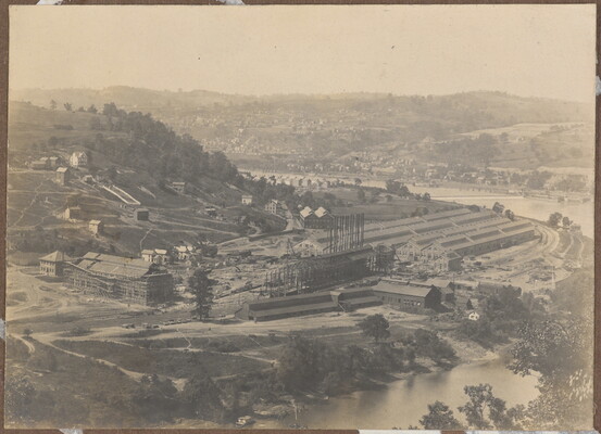 [View of construction by river]