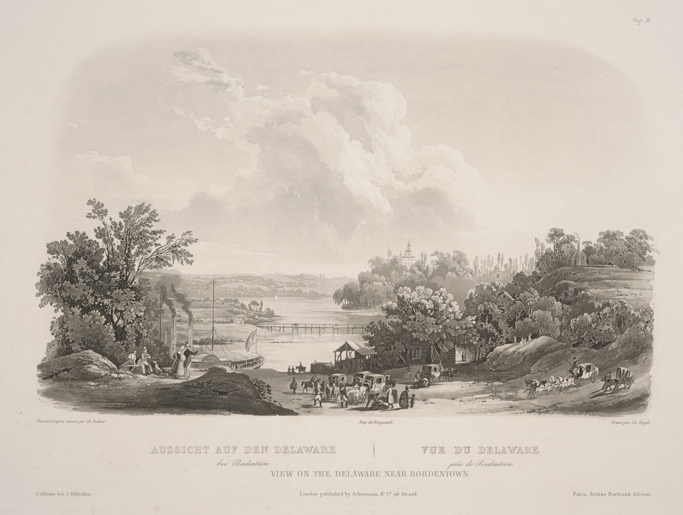 l.c.: Imp. de Bougeard \ AUSSUCHT AUF DEN DELAWARE VUE DU DELAWARE \ bei Bordentown prés de Bordentown \ VIEW OF THE DELAWARE NEAR BORDENTOWN \ London published by Ackermann & Co. 96 Strand.\ [blind stamp]