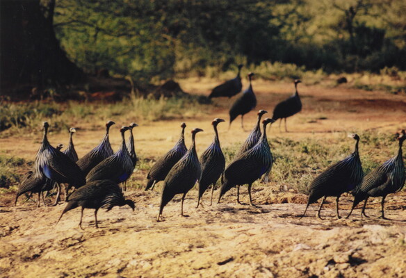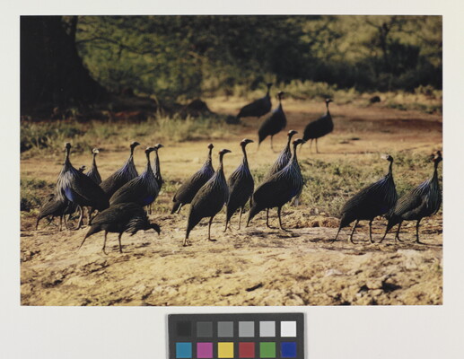 u.l. [stamp]: PHOTOGRAPH \ By \ ELIOT PORTER \ No. [in ink]: Roll 3, No. 27 \ [stamp]: Title [in ink]: Vulturine Guinea Fowl \ Samburu Reserve \ Kenya 1970