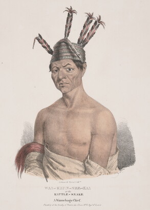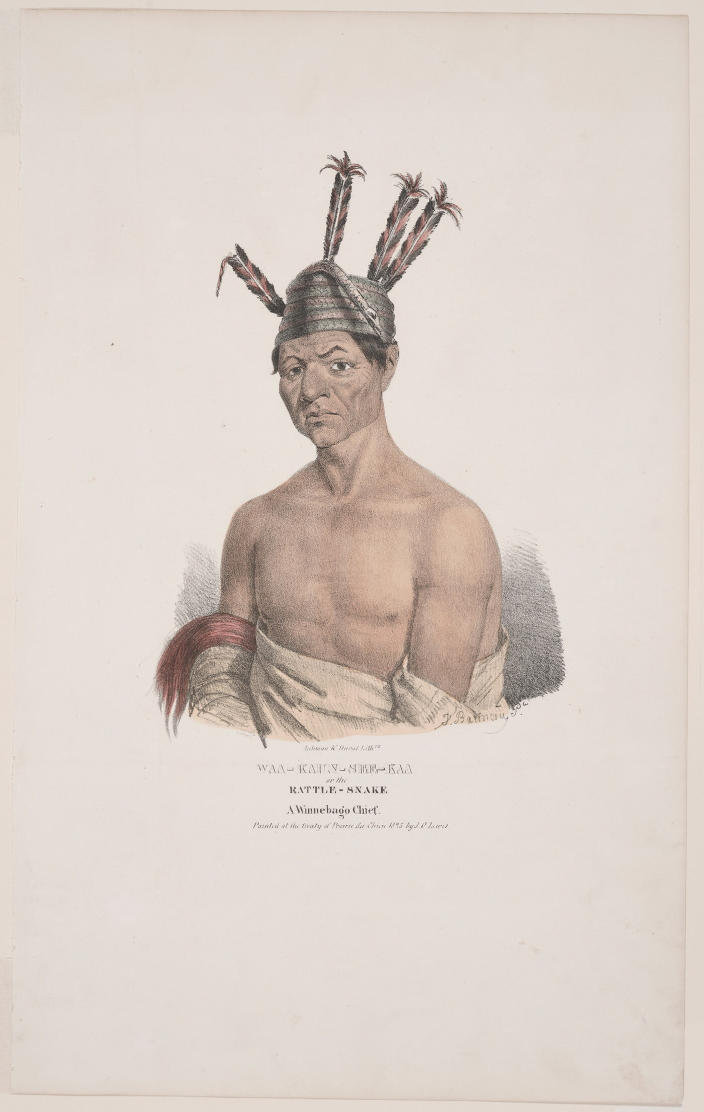 l.c.: Lehman & Duval Lith[rs]. \ WAA-KAUN-SEE-KAA \ or the \ RATTLE-SNAKE \ A Winnebago Chief. \ Painted at the treaty of Prairie du Chien 1825 by J.O. Lewis.