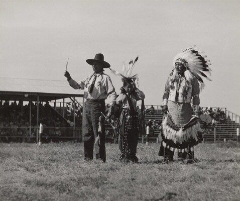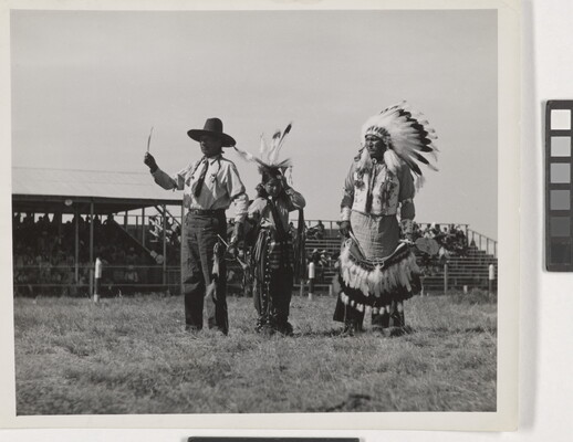 u.c. in graphite: Waiting to award honors \ (War bonnet in hand of \ man on right \ names l. \ m. \ r.