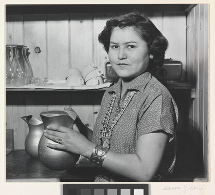 u.c. to c. printed on label: A PHOTOGRAPH BY \ LAURA GILPIN \ SANTA FE, NEW MEXICO [typed]: WAITRESS IN GALLUP RESTAURANT \ From THE ENDURING NAVAHO \ University of Texas Press, Pub. 1968