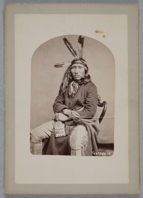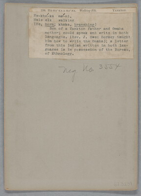 u.c. to u.r. printed on paper label: He-kha-ka ma-ni \ Male elk walking \ (He, horn; [underlined] khaka, branching [underlined] \ Son of a Yankton father and Omaha \ mother; could speak and write in both \ languages. (Rev. J. Owen Dorsey taught \ him how to write the Omaha); a letter \ from this Indian written in both lan- \ guages is in possession of the Bureau, \ of Ethnology.