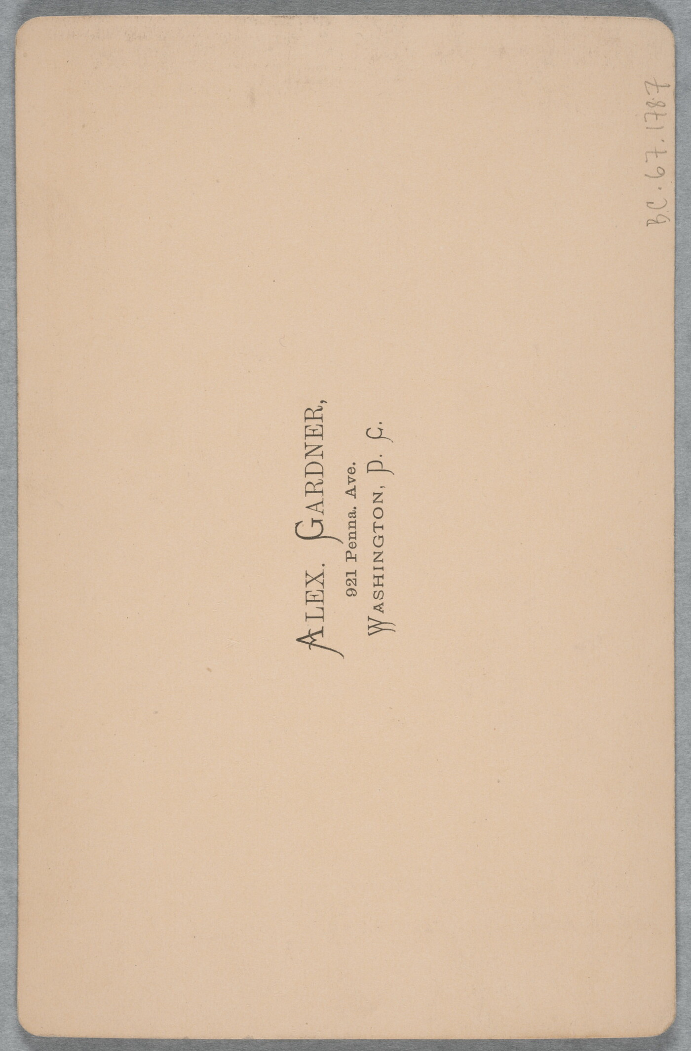 c. printed: ALEX. GARDNER, \ 921 Penna. Ave. \ WASHINGTON, D.C.