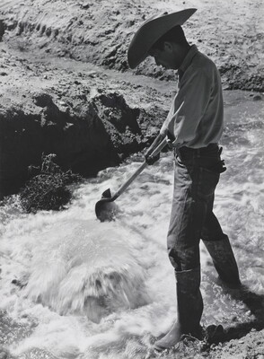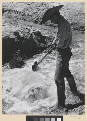 u.c. typed on blue paper label: No. [in graphite]: 87 \ [typed]: A YOUNG NAVAHO FARMER USING \ CHERISHED WATER FROM A NEWLY \ OPENED IRRIGATION PROJECT. \ EXTENSIVE DEVELOPMENTS LIKE THIS \ WILL TAKE PLACE WITH THE COMPLETION \ OF THE COLORADO RIVER WATER \ DEVELOPMENT PROGRAM.